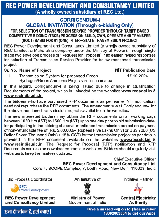| Request for Proposal Document for Selection of Bidder as Transmission Service Provider to develop Inter-State Transmission system for “Transmission System for Proposed Green Hydrogen / Green Ammonia projects in Vizag area, Andhra Pradesh (Phase-I)” through tariff based competitive bidding process. |