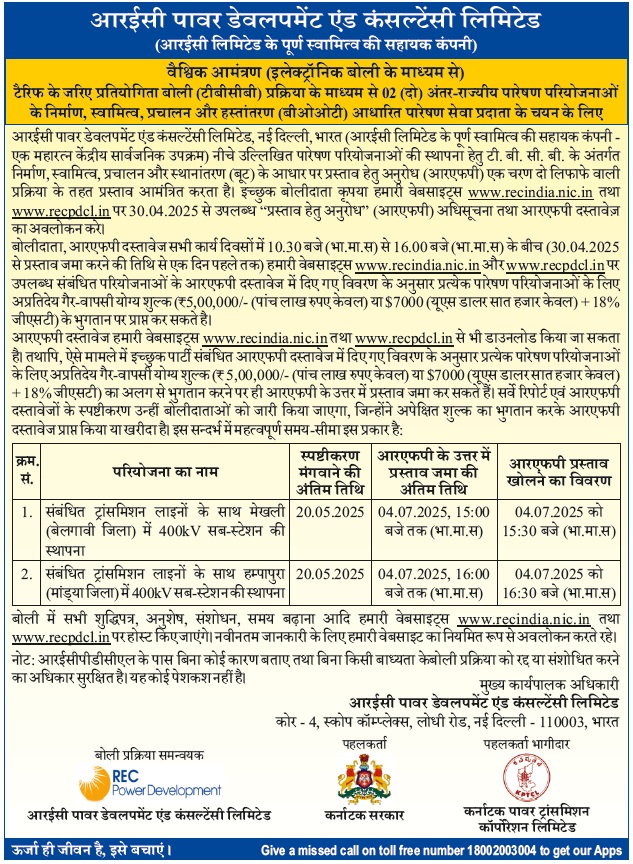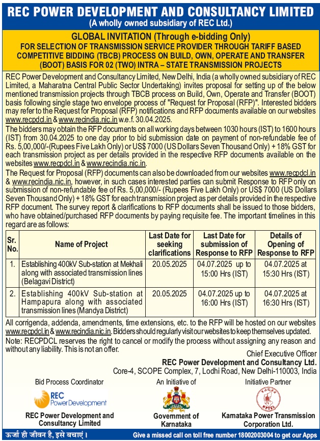 Request for Proposal Document for Selection of Bidder as Transmission Service Provider establish Intra-State Transmission system for “Establishing 400kV Sub-station at Mekhali along with associated transmission lines (Belagavi District)” through tariff based competitive bidding process.