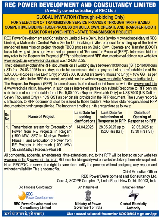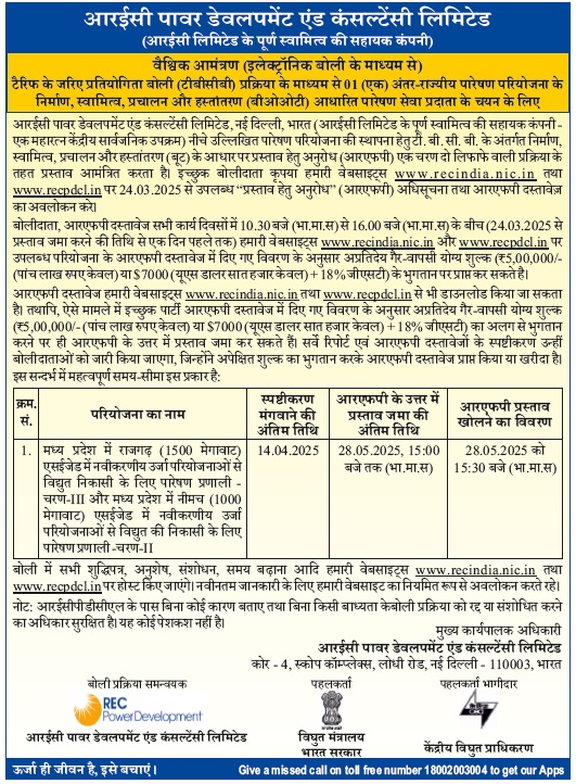 | Request for Proposal Document for Selection of Bidder as Transmission Service Provider to establish Inter-State Transmission system for “Transmission system for Evacuation of Power from RE Projects in Rajgarh (1500 MW) SEZ in Madhya Pradesh-Phase III and Evacuation of Power from RE Projects in Neemuch (1000 MW) SEZ in Madhya Pradesh-Phase II” through tariff based competitive bidding process. |