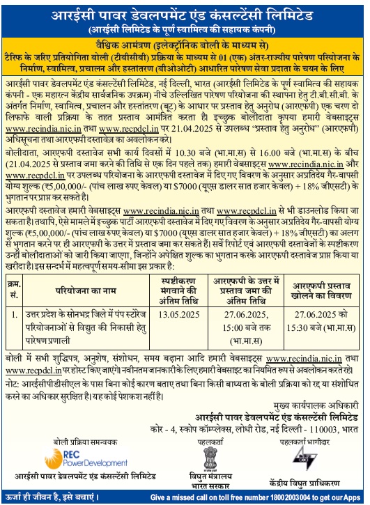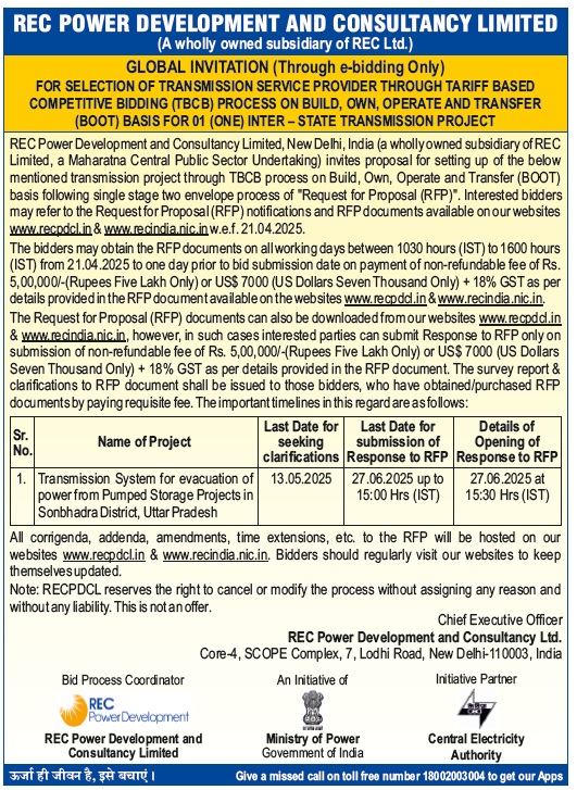 | Request for Proposal Document for Selection of Bidder as Transmission Service Provider to establish Inter-State Transmission system for “Transmission system for evacuation of power from Pumped Storage Projects in Sonbhadra District, Uttar Pradesh” through tariff based competitive bidding process. |