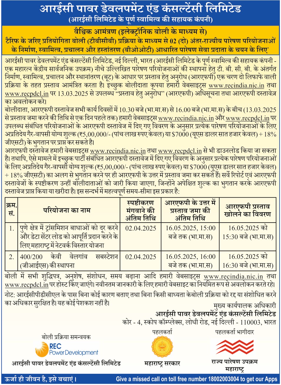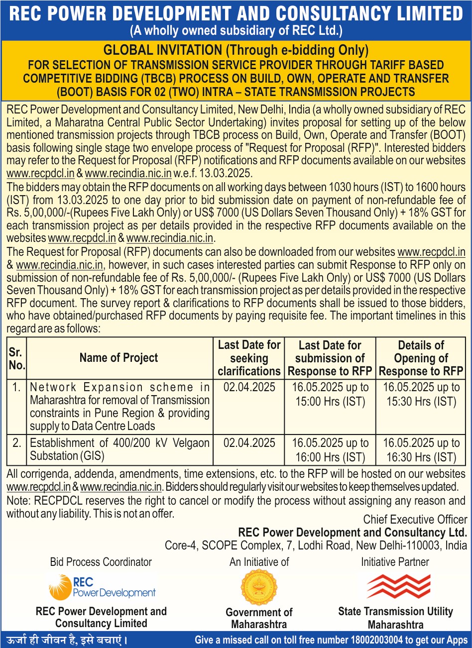 | Request for Proposal Document for selection of Bidder as Transmission Service Provider to establish Intra-State Transmission System for “Network Expansion scheme in Maharashtra for removal of Transmission constrains in Pune Region & providing supply to Data Centre Loads” through Tariff Based Competitive Bidding process. |